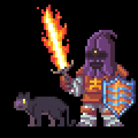 The Great Auberon Hero of the Flame, where to begin. Some say the last thing a wild beast will see in this world is his empty black gaze peering at it from under his hood. Not much is known of Auberon's origins, the fearsome flaming knight. Many think that he was once an ordinary man who came to know great tragedy and sorrow after a beast came for him and his family, brutally killing them, yet, somehow sparing him. A fate likely worse than death. After all, what is left to live for once you have lost everything. Auberon sought to seek revenge and this consumed him. A great wizard seeing his potential took him under their wing - training him in the ways of fire magic. What became of this relationship we are unsure as Auberon soon severed ties with his mentor and began to aimlessly wander the lands seeking revenge on the beast that took his family. Auberon is a killer, although some say there is good still in him. He has been known to save travelers from the clutches of death, but only if they are attacked by some abomination during their travels. We cannot say for sure that he does these deeds from the goodness of his heart. His companion, a Panther as dark as night, is the only being in this world that he trusts. How their bond came to be so strong only Auberon knows. Traveler, if you come across the decapitated remains of wild beast on your travels know that the great knight executioner has been that way - on his endless search for revenge.