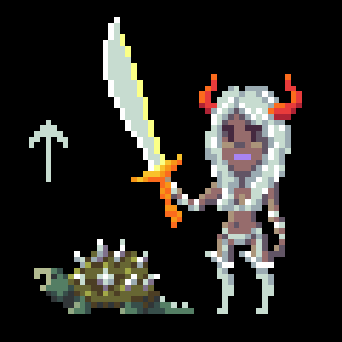 Image Description: An illustration of Bambam Nullifier of the Dread Tower. She has tanned skin and long white hair with two red horns sprouting from her head. She has a curvy figure and wears a skimpy white bikini with thigh-high boots and is perched upon the shell of her companion, a green mutant snapping turtle named Tank. Bambam winks at the viewer and blows a kiss with a little red heart.