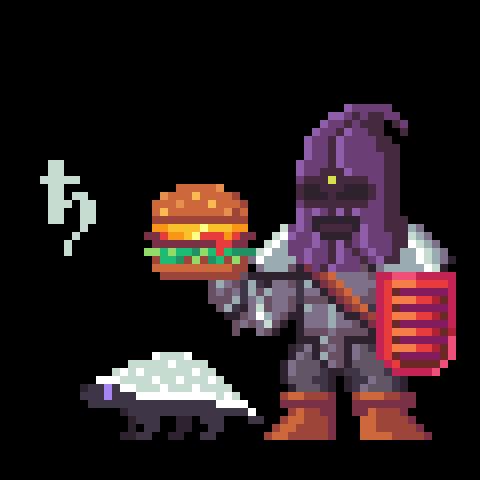 Aramastus was not alone on his journey. He had a fierce and loyal companion – a honey badger named Mr. Bites. Mr. Bites was a bit of a wild card. He was known to steal anything shiny, lick people's feet, and generally cause chaos wherever he went. But, Aramastus loved him all the same, and the two made quite the duo. They travelled the land, taking on odd jobs and causing a ruckus. And, with his cheeseburger in hand and executioner's hood on his head, Aramastus was ready for anything.