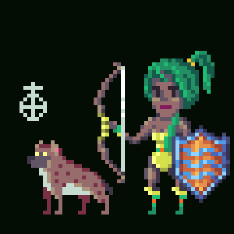 Tori's tale is not one born from the tranquil whispers of peace, but forged in the raging fires of the Blood War. With her head adorned in the garb of the Marsh Girl, her body clad in a Yellow One Piece, she wields her Shortbow with unmatched precision, her Blue Kite shield a testament to her defensive mastery. At her side, a Hyena, her loyal companion, bears witness to the countless tales of valor and sacrifice.