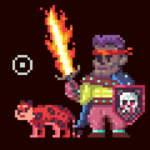 His beloved companion Flamesey is the brother of the famed Dragen, the crimson jaguar. Flamesey also speaks Dragon and is a fierce companion. As it is written in the Book of Lore: "Crimson jaguars have a natural resistance to fire and this is probably the reason the dragons do not eat the cat. Dragen is able to breath fire and is the only known cat do be able to do so and will toast his prey before snacking. This may be in part to a powerful enchantment but nobody really knows."