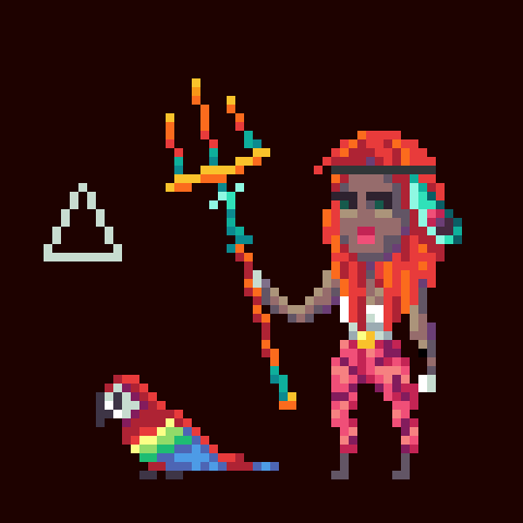 Her weapon of choice, a trident, symbolizes her command over fire, as marked by her rune. The flames dance to her will, serving as both a protector and destroyer when called upon. A scarlet macaw always perches on her shoulder, a companion as fiery and bold as Nkiru herself.