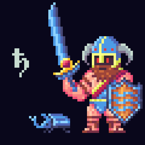 Hamma, bathed in blue with the protection of Saturn imbued in his armor, sword, and shield, serves the Azur Knights as a bounty hunter. While not a formal member of the guild— he prefers to fight only with his trusted Rhinoceros Beetle "Gorm"— he is most often hired to defeat Stone Idols and Earth Giants. It's rumored his blade weighs 10,000 pounds. A perfect tool for dismantling stone creatures who threaten the will of the Azul Knights.