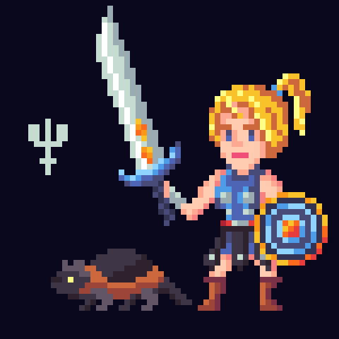 Her weapon, a Blue Broadsword, is not just a tool of war but an extension of her very soul. Forged in the heart of a dying star and cooled in the depths of the deepest sea, this blade has tasted the essence of glory and knows the weight of sacrifice. Each swing carries with it the echoes of ancient wars, the hopes of a people striving for peace, and the resolve to carve a path toward a future where light might finally pierce the veil of darkness.