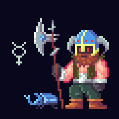 In the dark streets of the Capital, there roams a figure draped in mystery. Grimmold The Impaler, known for his fearsome blue dwarven helmet with horns pointing earthward, moves like a wraith among the alleys and boulevards of the sprawling city. His face, forever concealed in the depths of his helm, betrays nothing but the fierce red glow of his eyes, a reflection of the unquenchable fire within his soul. His magnificent bushy brown beard, the only part of his visage left to the imagination of the onlookers, sways like the boughs of an ancient tree with each determined step he takes. At his side, not as a weapon but as a constant reminder of the weight he carries, is his silver pole-axe, its blade kissed by a sapphire that gleams in the moonlight. This weapon, an extension of his will, has tasted the blood of many foes, each strike a plea to the forces that be to release his brother from a cruel fate. For Grimmold's companion, his brother, now walks the earth in a form far removed from his own. Cursed by a malicious shaman during a skirmish that was meant to be their last together, his brother's essence was trapped in the body of a rhinoceros beetle. This beetle, large and ethereal with eyes that mirror Grimmold's own fiery gaze, is a constant companion atop his shoulder, a silent witness to Grimmold's relentless quest for redemption. The curse, a twisted spell woven with malice and dark magic, has proven unbreakable by common means. Grimmold has sought the aid of the most powerful healers, mages, and ancient beings that dwell in the hidden folds of the Runiverse, each attempt ending in despair. Yet, the bond between the brothers, now tested in ways unimaginable, remains unbroken. Grimmold's resolve has only hardened with each setback, his determination turning into the stuff of legends whispered in the taverns and around campfires. Grimmold's journey has taken him across the reformed landmass of the new Pangea, through realms where magic thrums with life and others where technology clings to existence. In places where the air shimmers with enchantment, he has battled demons and beasts, each victory and defeat etching deeper lines of resolve on his unseen face. In the neon-lit streets of technologically advanced cities, he has parleyed with beings who control elements with the flick of a wrist, their magic alien yet potent. The tale of Grimmold and his beetle brother is a testament to the power of will against the capriciousness of fate. It is a story that continues to unfold, a quest that has yet to reach its conclusion. For Grimmold Impaler of the Capital, the journey is far from over. His brother's curse is a chain that binds them both, but it is a chain that Grimmold is determined to break, no matter the cost, no matter the distance. And in his silent, steadfast companion, he finds the strength to continue, their shared gaze a beacon in the darkness that surrounds them.