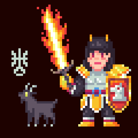 To Mayumi's surprise, the sword floated above the pool, not in ashes as any wooden sword would be, but encased in roaring flames. The goat nudged her again as she looked at the sword, then at the goat, then back at the sword. Reaching out to the hilt, it wasn't hot to her touch. She gripped the sword tightly and thrust it in the the air, before swinging it around her head.