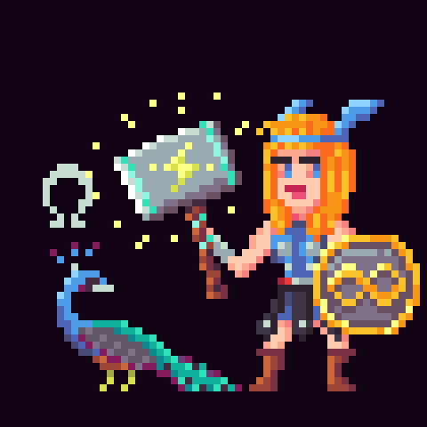Flavia's breath was heavy, her thoughts weighed by the devastation around her. In her right hand, she gripped a hammer, its surface etched with intricate runes that still faintly glowed with residual power. Draped on her left arm was a round shield, ornamented with gold to form a border and two loops intersecting in a never-ending pattern. For a moment, she wondered how the shield had withstood all those blows without bearing a single mark. But then she remembered who had given it to her, and perhaps the legends were true.